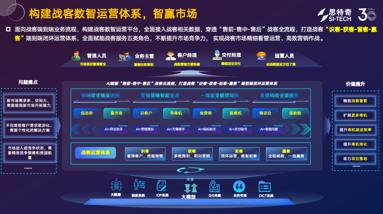 此次大會期間,思特奇展出的“市場全息作戰”與“政企智慧運營”兩大方案,形成了覆蓋國內大眾市場、國內政企戰客、國際全域業務的全域賦能矩陣,并對行業轉型瓶頸做出突破性破解:首先,跳出傳統業務支撐“工具化”的局限,以全鏈路數智能力深度參與運營商戰略落地,升級為“戰略賦能”角色;其次,突破單一場景優化的壁壘,拉通大眾市場與政企市場、國內業務與國際業務的跨域協同,讓運營效能形成聚合效應;另外,突破地域運營邊界,通過全球化運營能力構建,助力運營商在國際市場搶占先機,形成全域增長格局。
