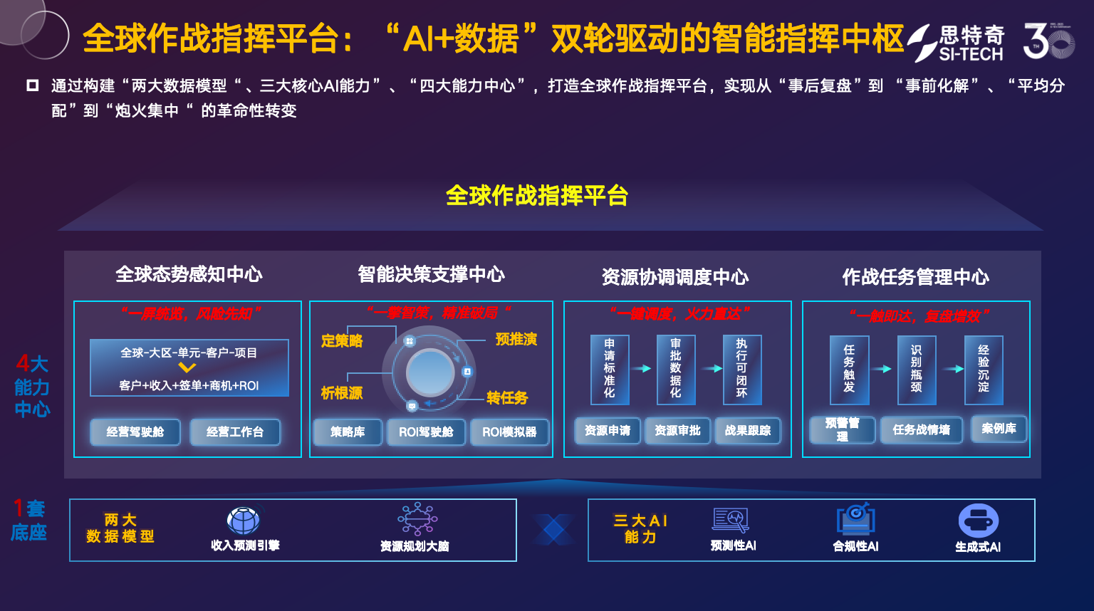 面向全球化布局需求,"政企智慧運營"方案升級打造"感知-決策-執行-反饋"端到端全球作戰指揮體系,以收入預測引擎和資源規劃引擎為兩大核心抓手,構建全球化運營核心能力: