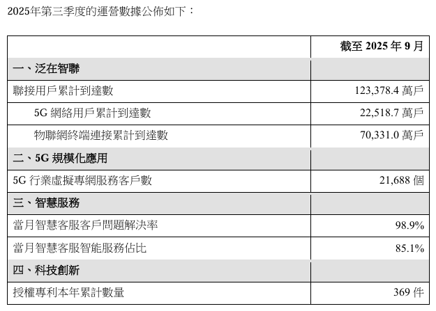 數據顯示,2025年第三季度,中國聯通聯接用戶總數達到12.33784億戶,物聯網終端連接累計達7.0331億戶,5G行業虛擬專網服務客戶數達21688個,當月智慧客服客戶問題解決率達98.9%,當月智慧客服智能服務占比達85.1%,授權專利本年累計數量達369件。