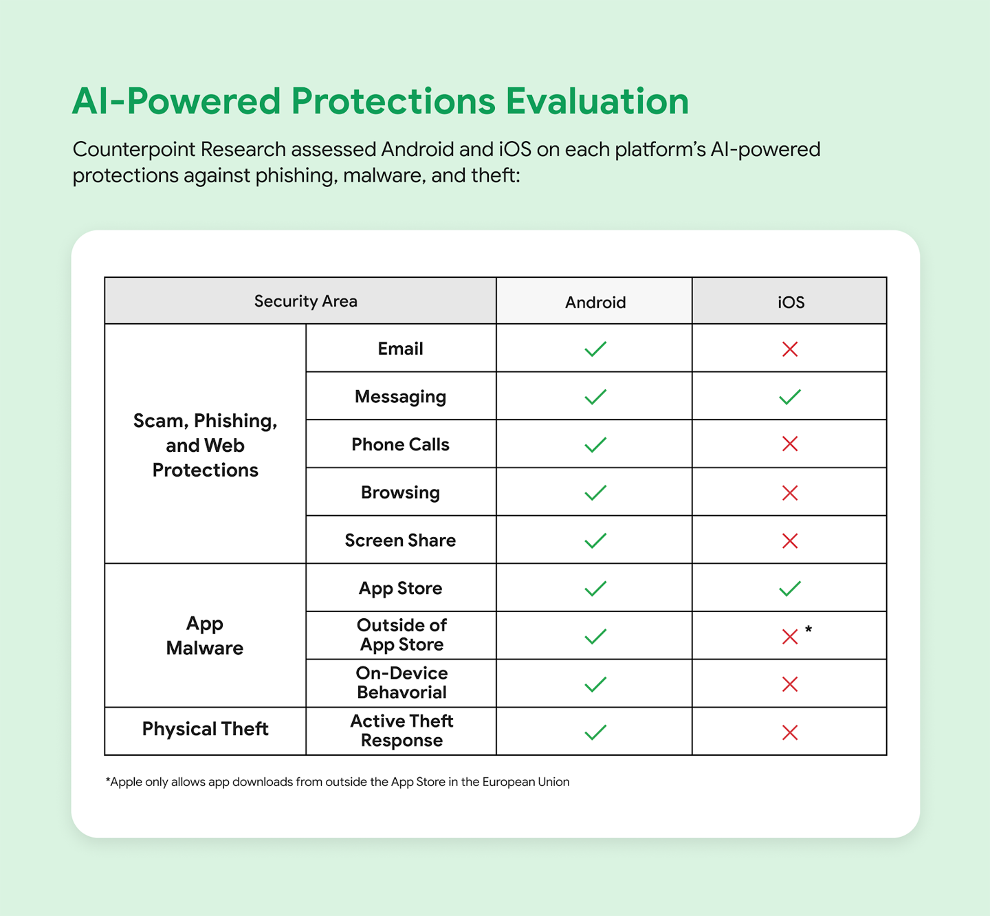 研究機構 Counterpoint Research 的一份報告指出,安卓設備可在九個關鍵安全層面上提供基于 AI 的防護,而 iPhone 僅覆蓋了其中兩個。