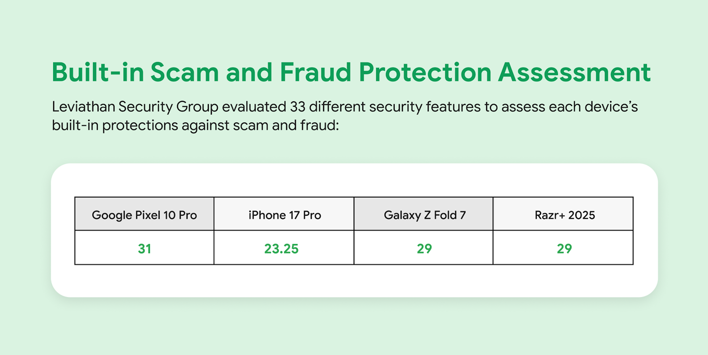 另一家安全公司 Leviathan Security Group 的評估結果更為直接,將 Pixel 10 Pro 列為默認詐騙防護能力最強的設備,領先于其他安卓旗艦機型和 iPhone 17 Pro。