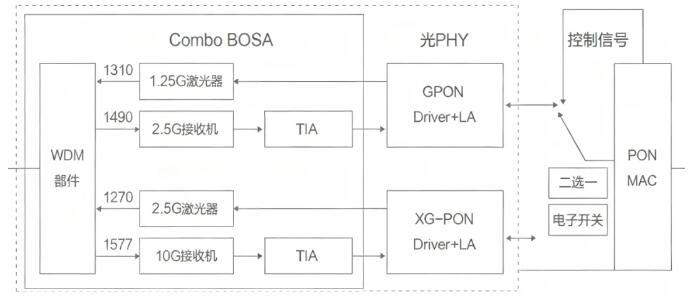 我們首先簡單來看一下Combo FTTR器件技術:與傳統(tǒng)GPON BOSA或10G PON BOSA相比,F(xiàn)TTR+上聯(lián)接口BOSA通過內部WDM將收發(fā)功能進行合分波集成,形成小型化Combo光器件。這種設計優(yōu)化了器件結構,提高了集成度。同時,BOB方案的應用使得光PHY與MAC直接相連,簡化了信號處理流程。一個Combo PON BOSA同時包含了GPON和10G PON的兩個物理通道,為FTTR主設備提供了豐富的物理接口選擇。