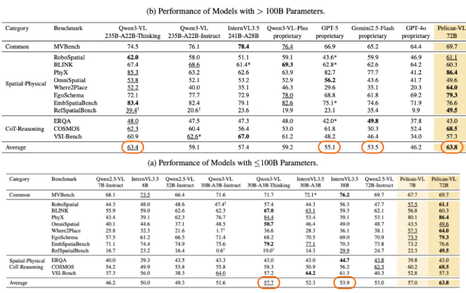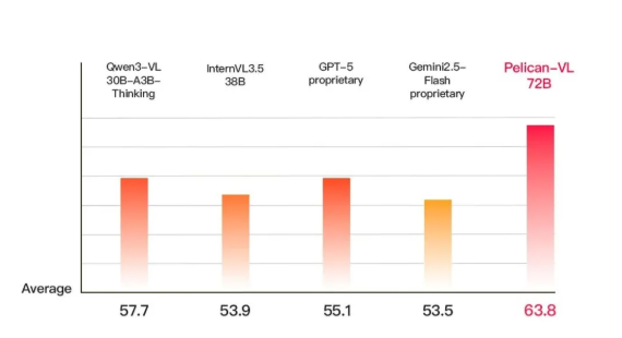 本次開源的 Pelican-VL 1.0 的核心優(yōu)勢在于深度整合海量數(shù)據(jù)與自適應學習機制,在由 1000+ A800 GPU 組成的集群上訓練,單次檢查點訓練耗費超過 50,000 A800 GPU-小時;團隊從原始數(shù)據(jù)中蒸餾出的包含數(shù)億 token 的高質(zhì)量元數(shù)據(jù)以做訓練基石。基于上述優(yōu)勢,Pelican-VL 1.0 實現(xiàn)了在基線基礎上性能提升 20.3%,平均超過 Qwen3-VL 系列、InternVL3.5 系列等同級別開源模型 10.6%。