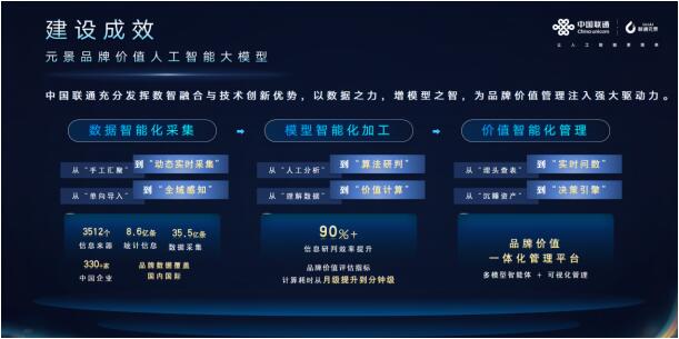 元景品牌價值人工智能大模型針對品牌建設中品牌價值評估量化“難”、資源要素配置指導“難”、品牌國際化精準作戰“難”三大難題,依托中國聯通數智融合、自主創新的經驗,發揮大數據與人工智能領域優勢,研發了管理駕駛艙、企業決策站、指標導航儀三大智能化解決方案,構建了企業品牌管理的數智化核心支撐平臺,實現了“讀得懂財報、算得出價值、說得清歸因”的全流程能力。