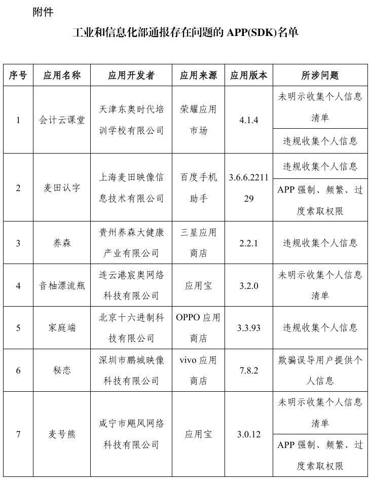 附件:工業和信息化部通報存在問題的APP(SDK)名單