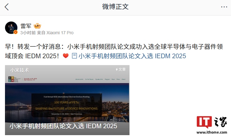 12 月 14 日消息,小米創辦人、董事長兼 CEO 雷軍今日轉發了一則消息:小米手機射頻團隊論文成功入選全球半導體與電子器件領域頂會 IEDM 2025。小米技術官方表示,此次入選標志著氮化鎵高電子遷移率晶體管技術在移動終端通信領域實現歷史性突破,并獲得國際頂尖學術平臺的高度認可。