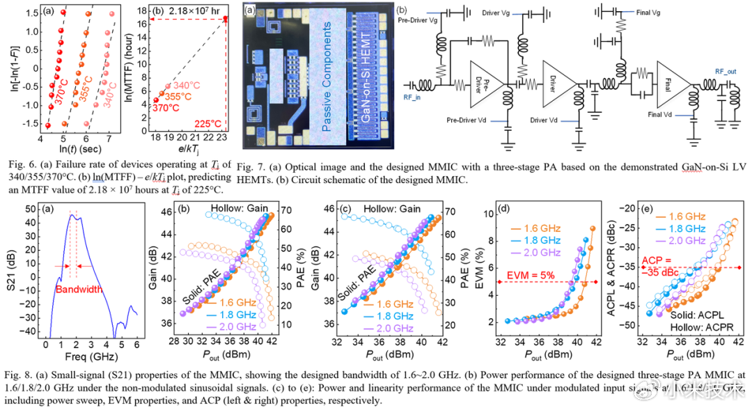 在模組集成層面,通過多芯片協同設計與封裝技術,實現了 GaN HEMT 工藝的功放芯片與 Si CMOS 工藝的電源管理芯片在模組內進行高密度封裝集成。最終,該器件在手機射頻前端系統中完成了關鍵性能指標的全面驗證,為低壓氮化鎵技術在下一代移動通信終端中的應用提供重要參考。