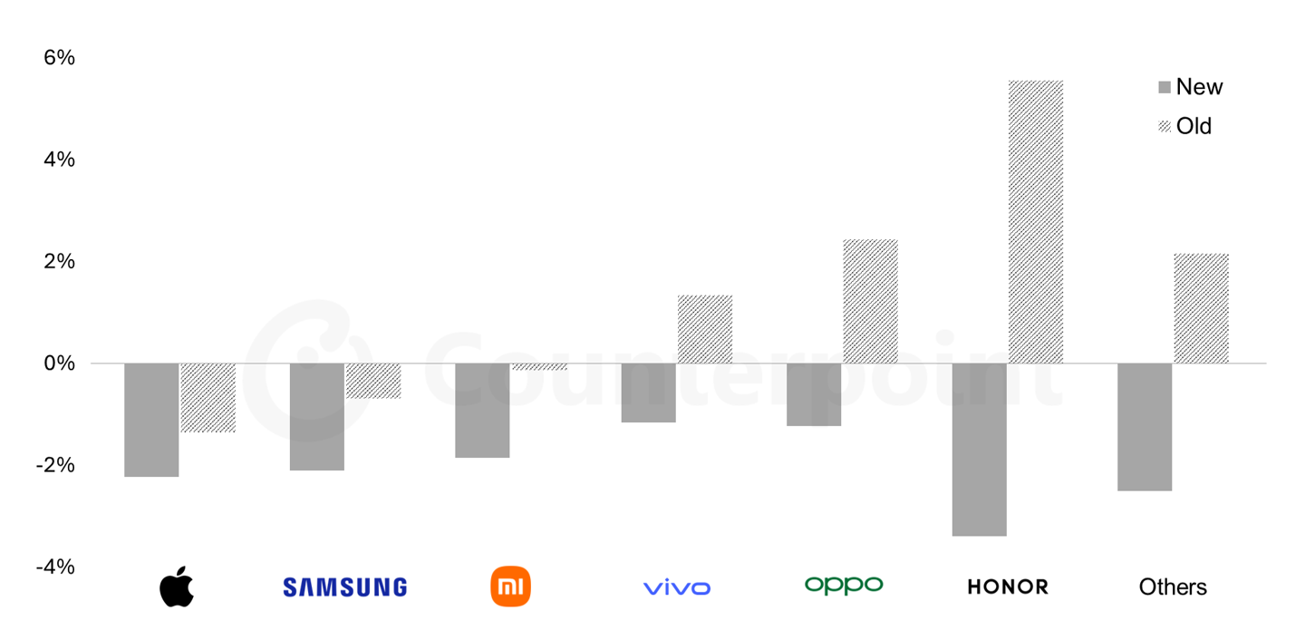 Counterpoint 指出,內(nèi)存芯片短缺對智能手機市場的沖擊將呈現(xiàn)結(jié)構(gòu)性差異,其中榮耀、OPPO 等中國品牌因利潤率較低,抗風險能力相對更弱,中低端入門機型受到的影響尤為顯著。