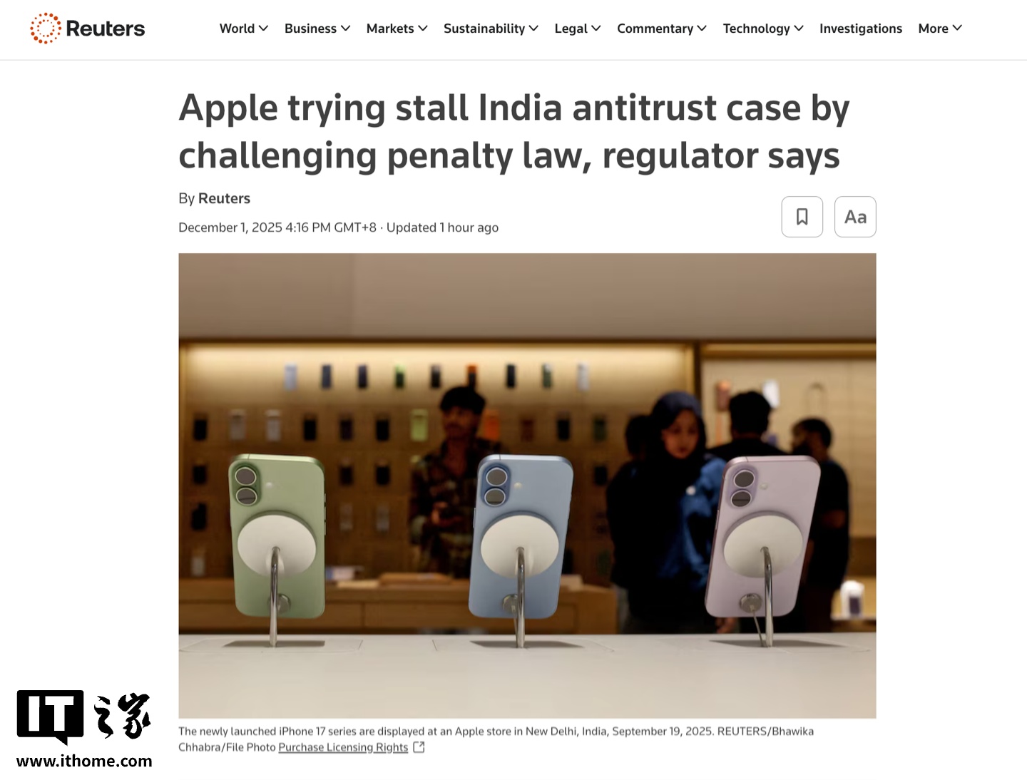12 月 1 日消息,據路透社今日報道,印度反壟斷監管機構向新德里法院表示,蘋果試圖通過質疑印度的反壟斷罰款制度來拖延相關調查。