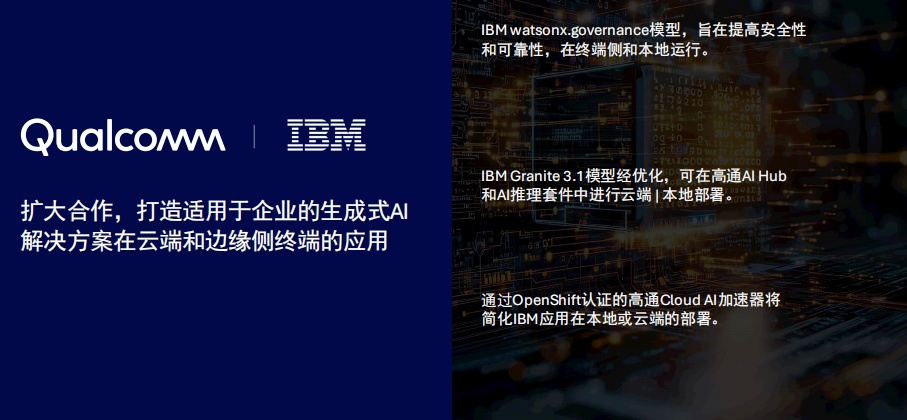 2 月 27 日消息,高通公司今天宣布,將在生成式 AI 在企業(yè)級(jí)場(chǎng)景落地方面與 IBM 進(jìn)行合作,高通表示,雙方將共同打造適用于企業(yè)的生成式 AI 解決方案在云端和邊緣側(cè)終端的應(yīng)用。