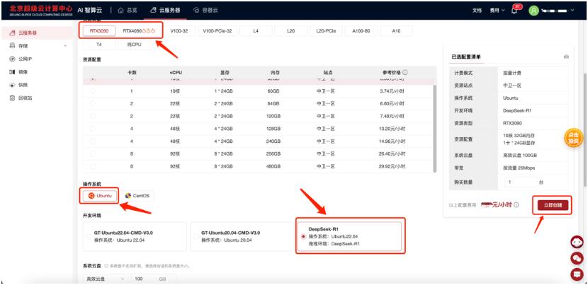 選擇創建云服務器 -> 選中圖中鏡像,配置云盤與帶寬等參數 -> 創建資源。