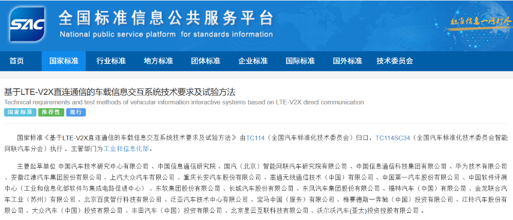 近日,國家市場監(jiān)督管理總局、國家標(biāo)準(zhǔn)化管理委員會發(fā)布2025年第4號中國國家標(biāo)準(zhǔn)公告,GB/T 45315-2025《基于LTE-V2X直連通信的車載信息交互系統(tǒng)技術(shù)要求及試驗方法》(以下簡稱GB/T 45315-2025)正式發(fā)布,該標(biāo)準(zhǔn)于發(fā)布之日起開始實施,這標(biāo)志著我國汽車行業(yè)首個直連通信國家標(biāo)準(zhǔn)正式發(fā)布并實施。該標(biāo)準(zhǔn)由工業(yè)和信息化部提出,由全國汽車標(biāo)準(zhǔn)化技術(shù)委員會(SAC/TC114)歸口。