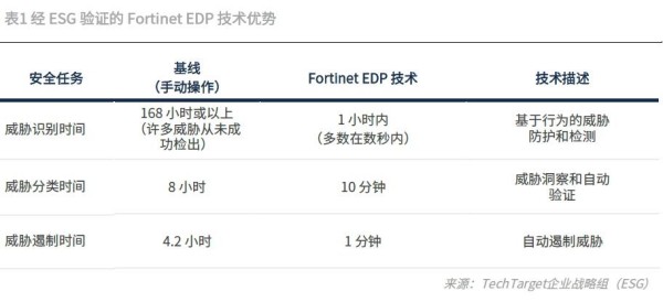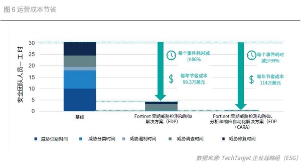 運營成本節省。Fortinet的自動化SOC解決方案高度自動化、智能化,顯著降低了人力需求。據ESG報告,部署EDP技術的組織,單次事件平均耗時銳減至約14%(節省86%時間),提高了處理效率,降低了運營成本。同時,Fortinet的托管服務也提供了經濟高效的安全運營方式。