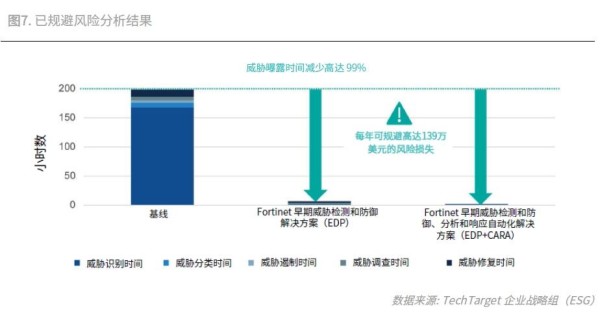 最終,ESG針對用戶部署Fortinet自動化SOC解決方案所能獲得的預期時間節省和經濟效益,基于威脅平均識別時間指標,對基線案例、EDP(早期檢測和預防)案例、以及EDP+SOC平臺和服務案例建模,圍繞運營成本節省、風險規避以及預期總節省成本三大方面展開分析。