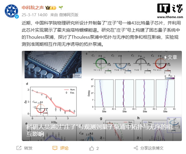 該團隊自主設計并制備了“莊子”號一維 43 比特量子芯片,并利用此芯片實現展示了霍夫施塔特蝴蝶能譜。科研人員在“莊子”號上構建了固態量子系統中的 Thouless 泵浦,探討了 Thouless 泵浦中拓撲與無序的競爭和相互影響,實驗觀測到準周期相互作用無序誘導的拓撲泵浦。