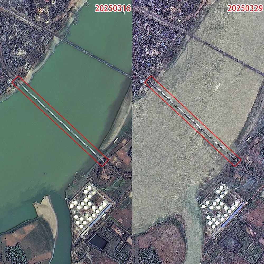 ▲ 圖 2 緬甸地震受災(zāi)前后光學(xué)衛(wèi)星圖像(災(zāi)前:高分一號 03 衛(wèi)星 2025 年 3 月 16 日采集,災(zāi)后:資源一號 02D 衛(wèi)星 2025 年 3 月 29 日采集)