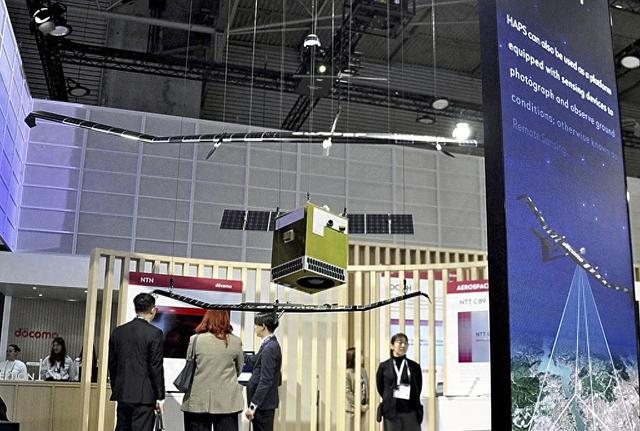 當地時間2025年3月4日,在西班牙巴薩羅那的全球移動通信大會上,NTT DOCOMO展位展出了類似滑翔機的