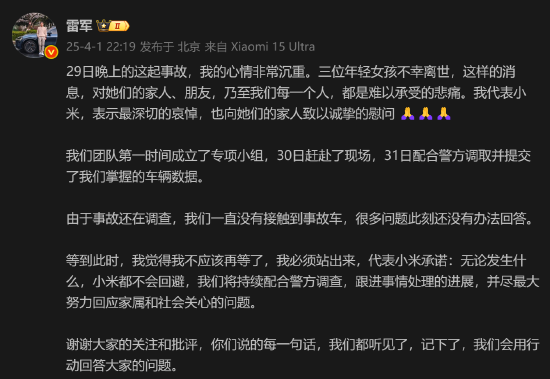 29日晚上的這起事故,我的心情非常沉重。三位年輕女孩不幸離世,這樣的消息,對她們的家人、朋友,乃至我們每一個人,都是難以承受的悲痛。我代表小米,表示最深切的哀悼,也向她們的家人致以誠摯的慰問。