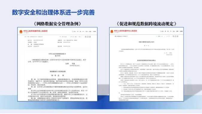 《報告》指出,數字安全和治理體系進一步完善,出臺《網絡數據安全管理條例》,印發《促進和規范數據跨境流動規定》。車聯網安全治理形成“檢測—防護—管理”閉環。數據標準化工作邁出堅實步伐,成立全國數據標準化技術委員會,發布《國家數據標準體系建設指南》。
