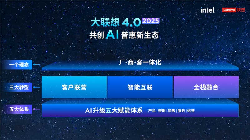 面對AI浪潮帶來的史詩級機遇,“大聯(lián)想4.0”在2025年全新升級。白晶在大會現(xiàn)場表示,“希望和大聯(lián)想伙伴一起踐行廠商客一體化的理念,向客戶聯(lián)營、智能互聯(lián)、全棧融合三大方向轉(zhuǎn)型。聯(lián)想也會通過全價值鏈的五大賦能體系,為合作伙伴保駕護航。”