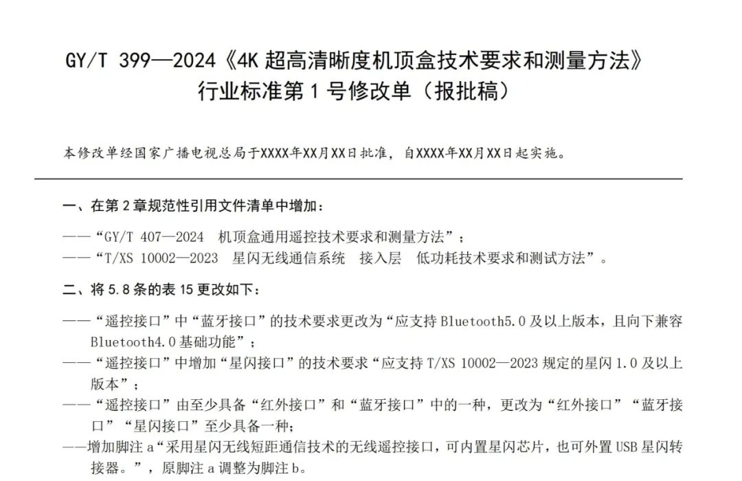 該修改文件中顯示,機(jī)頂盒的遙控接口的技術(shù)要求進(jìn)行了補(bǔ)充和完善,特別是增加了對(duì)星閃無(wú)線通信技術(shù)的支持。