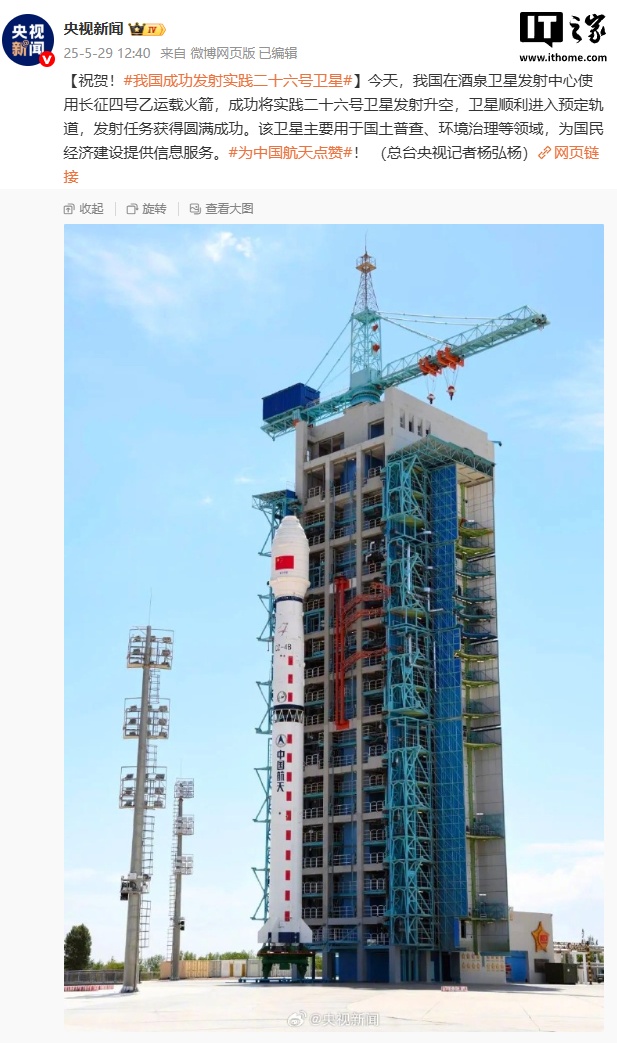 5 月 29 日消息,據央視新聞報道,北京時間 2025 年 5 月 29 日 12 時 12 分,我國在酒泉衛星發射中心使用長征四號乙運載火箭,成功將實踐二十六號衛星發射升空,衛星順利進入預定軌道,發射任務獲得圓滿成功。該衛星主要用于國土普查、環境治理等領域,為國民經濟建設提供信息服務。
