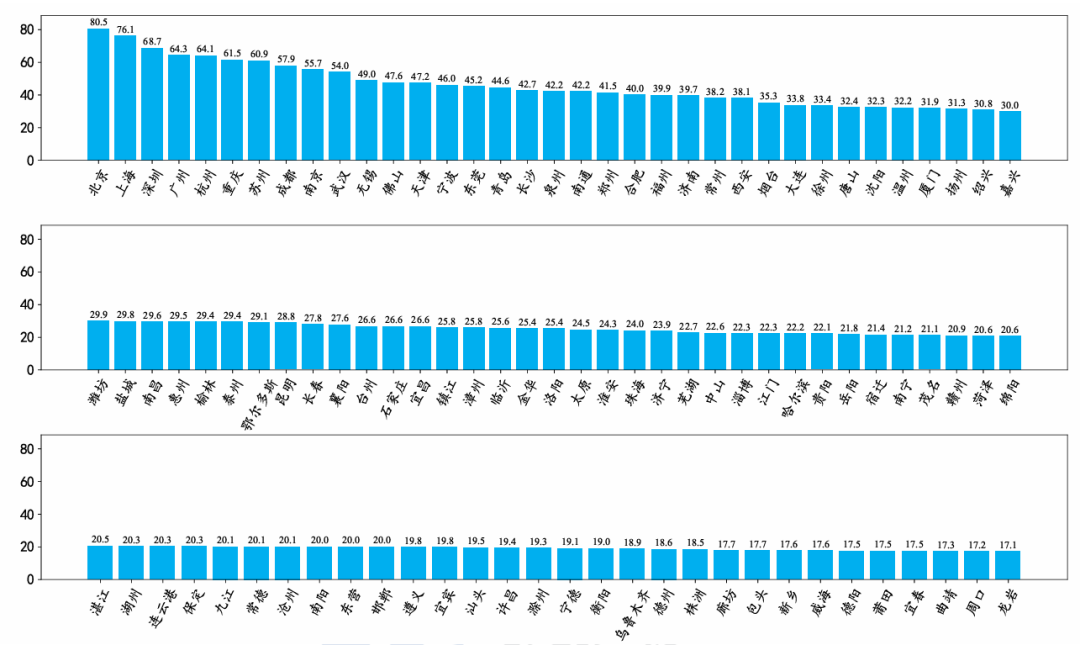 第三梯隊共27個城市,其中江蘇、浙江均有5個地級市進入 第三梯隊,福建、湖北、河北、遼寧、山東各有2個地級市進入第三梯隊, 廣東、河南、江西、云南、陜西、內蒙古、吉林各1個地級市/盟市進入第三梯隊。