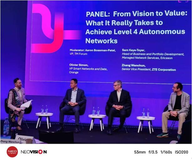 在本次會上,TM Forum Innovation VP Aaron Boasman 與中興通訊高級副總裁張萬春及愛立信、Orange運(yùn)營商一起就AN L4推進(jìn)中的關(guān)鍵問題進(jìn)行了 深入討論。張萬春指出目前自智網(wǎng)絡(luò)已經(jīng)進(jìn)入深層次發(fā)展,中興通訊的AIR Net方案基于AI大模型、大數(shù)據(jù)和數(shù)字孿生三大自智網(wǎng)絡(luò)平臺及中興開源的Co-sight智能體框架,構(gòu)建多個角色Copilot助手和場景Agent專家,在網(wǎng)絡(luò)節(jié)能降耗、故障處理自動化智能化以及降低用戶投訴等方向有多項落地成果。