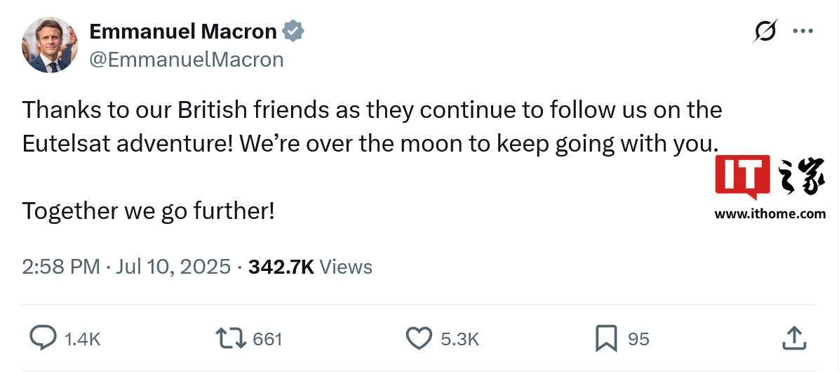 7 月 13 日消息,歐洲通信衛星企業、衛星互聯網運營商 Eutelsat 法國巴黎當地時間 10 日宣布,英國政府計劃參與其合計 15 億歐元(IT之家注:現匯率約合 125.77 億元人民幣)的新一輪增資。
