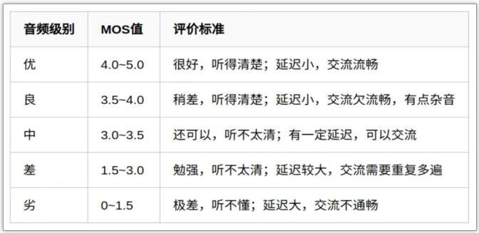 MOS值作為一種主觀測試方法,將用戶接聽和感知語音質量的行為進行調研和量化,由不同的調查用戶分別對原始標準語音和經過無線網傳播后的衰退聲音進行主觀感受對比,評出MOS分值。國際電信聯盟(International Telecommunication Union,ITU)將MOS評測規范化為ITU-T P.800,其中絕對等級評分(Absolute Category Rating,ACR)應用最為廣泛,ACR的詳細評估標準如下表所示。