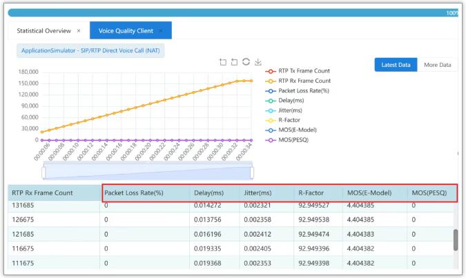 3. 關鍵網絡性能指標統計,如丟包率、時延和抖動,全面評估語音質量的穩定性與清晰度。同時,結合ITU-T推薦的E-Model算法計算R-Factor和MOS值,以及PESQ算法的MOS評分,兼顧客觀建模與主觀聽感模擬。多維度的質量評估幫助用戶全面掌握語音通信在不同網絡環境下的真實表現,為產品優化和部署提供有力支持。