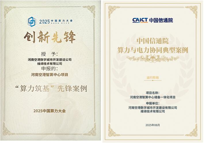 大會期間,主辦方揭曉了備受業(yè)界矚目的相關(guān)評選結(jié)果。河南空港數(shù)字城市開發(fā)建設(shè)有限公司與維諦技術(shù)(Vertiv)聯(lián)合申報的“河南空港智算中心項目”,榮膺“創(chuàng)新先鋒優(yōu)秀成果獎”、“典型智算項目案例”兩項殊榮。