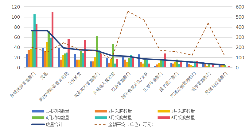 上半年公開投資采購市場整體呈現上升趨勢,自然資源管理和應急管理部門采購需求最為旺盛。上半年公開采購累計發生1830起,已披露總金額達到39億元。其中五月采購金額位居榜首,占上半年全部采購金額的25%。自然資源管理部門和應急管理部門上半年共計采購13億元,采購金額位居前二。此外,應急管理、消防救援、城市管理等部門財力雄厚,平均采購金額位居前三。