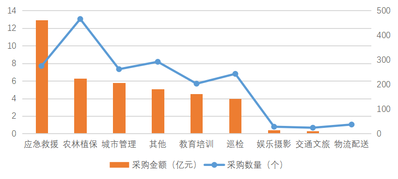 應急救援和農林植保是目前發展較為成熟的場景,應急救援類相對單價更高。農林植保上半年采購數量最多,共發生466起;應急救援類場景采購金額最多,超12億元,其中無人機或直升機以及配件等硬件金額占比達90.6%。以政府主導的公共服務類場景如應急救援等大單相對集中,與政策補貼資金流向相同,如應急部門上半僅發生110次采購,平均每筆采購事件達到555萬元。行業類采購如農林植保高頻小單較多,部分農業公司提供防治等服務,服務價格相對采購更低,依據防治面積定價(目前單價≤20元/畝)或隨采購農藥產品搭售。