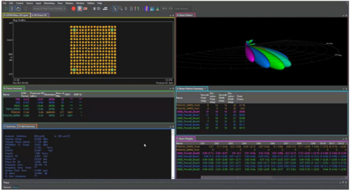 要測試大規模多輸入多輸出無線電單元,需要具備:O-DU模擬器,配備通過以太網接口生產、播放、捕獲和測量O-RAN流量的工具;多射頻收發器,用于在不同方向上產生帶有噪聲和干擾的波束,并同時接收信號。測試裝置不僅需要測量上行和下行鏈路方向的所有波束和信號,還需要能夠精確定位波束賦形問題。圖4顯示了帶幅度和相位權重的下行鏈路波束賦形示例,以及相應的波束模式和EVM數據。