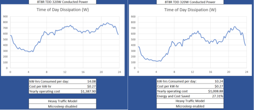 O-RU是接入網中功耗最高的組件。不過,可以通過多種手段實現節能,例如可變時鐘、動態功率放大器偏置、小區和載波關閉、射頻信道重新配置、睡眠模式、間斷收發等。隨著RAN的分解,需要明確各組件特性,以全面了解系統和網絡層面的權衡。圖5對比展示了啟用和未啟用微睡眠模式時,O-RU站點在24小時內的功耗以及潛在的節能效果。