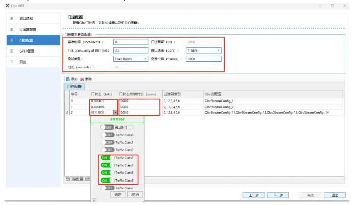 門控中依次添加三個GCL列表項,門狀態(tài)中指定門狀態(tài),0為關(guān)門,1為開門。列表0放行優(yōu)先級0流量、列表1放行優(yōu)先級1流量、列表2放行3、4、5、6優(yōu)先級流量。門狀態(tài)持續(xù)時長設(shè)置每個列表的持續(xù)時間,所有列表持續(xù)時間之和為Oper Cycle Time此例設(shè)置每個GCL持續(xù)時間為1ms,Oper Cycle Time為3ms;過濾器索引為測試儀統(tǒng)計不同GCL放行流量的落點情況。(門控規(guī)則與DUT保持一致)