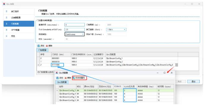 配置Qbv流量,點擊自動創(chuàng)建流量會自動生成對應(yīng)優(yōu)先級的Qbv流,也可以點擊“添加”手動創(chuàng)建其他流量,配置測試類型為Continuous。