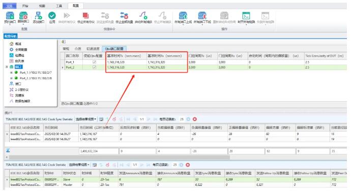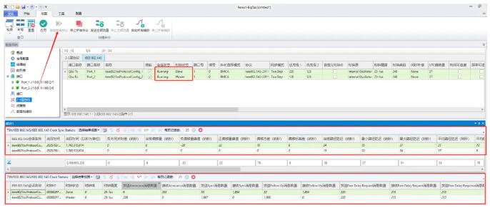 配置AS協(xié)議并點擊完成,在配置導(dǎo)航欄中可看到生成的AS協(xié)議,點擊啟動所有協(xié)議,能看到測試儀Telkerd端口AS時鐘狀態(tài)為Slave,Listener端口AS時鐘狀態(tài)為Master,統(tǒng)計中能看到時間偏移量及協(xié)議包交互數(shù)量均正常,時間同步是Qbv調(diào)度基準(zhǔn)時間的基石,需優(yōu)先確保其建立成功。