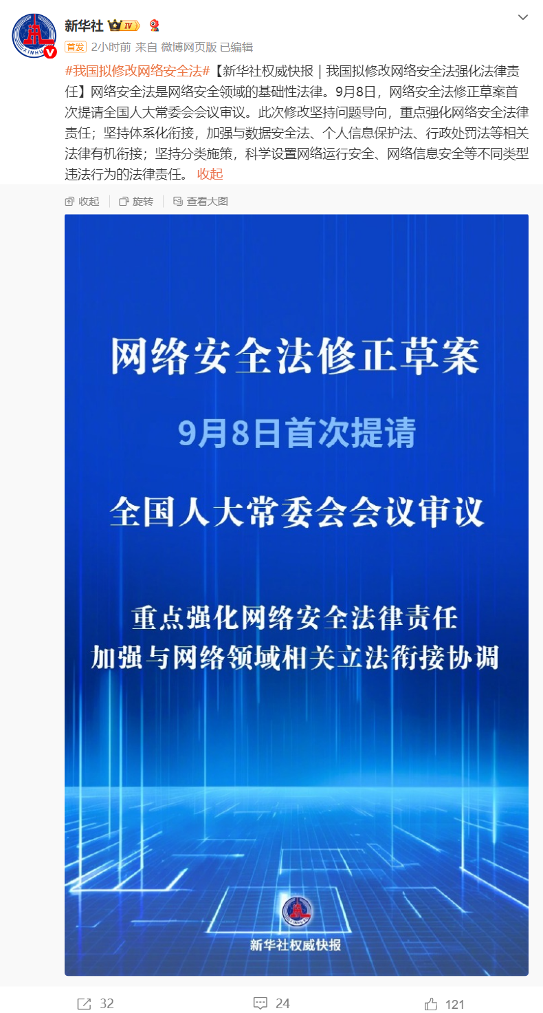 9 月 8 日消息,據(jù)新華社今日?qǐng)?bào)道,網(wǎng)絡(luò)安全法是網(wǎng)絡(luò)安全領(lǐng)域的基礎(chǔ)性法律。9 月 8 日,網(wǎng)絡(luò)安全法修正草案首次提請(qǐng)全國(guó)人大常委會(huì)會(huì)議審議。